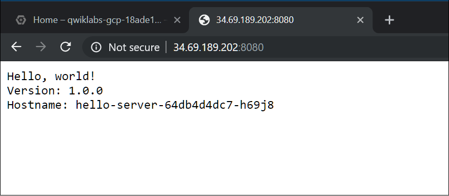 To view the application from your web browser, open a new tab and enter the following address, replacing [EXTERNAL IP] with the EXTERNAL-IP for hello-server.